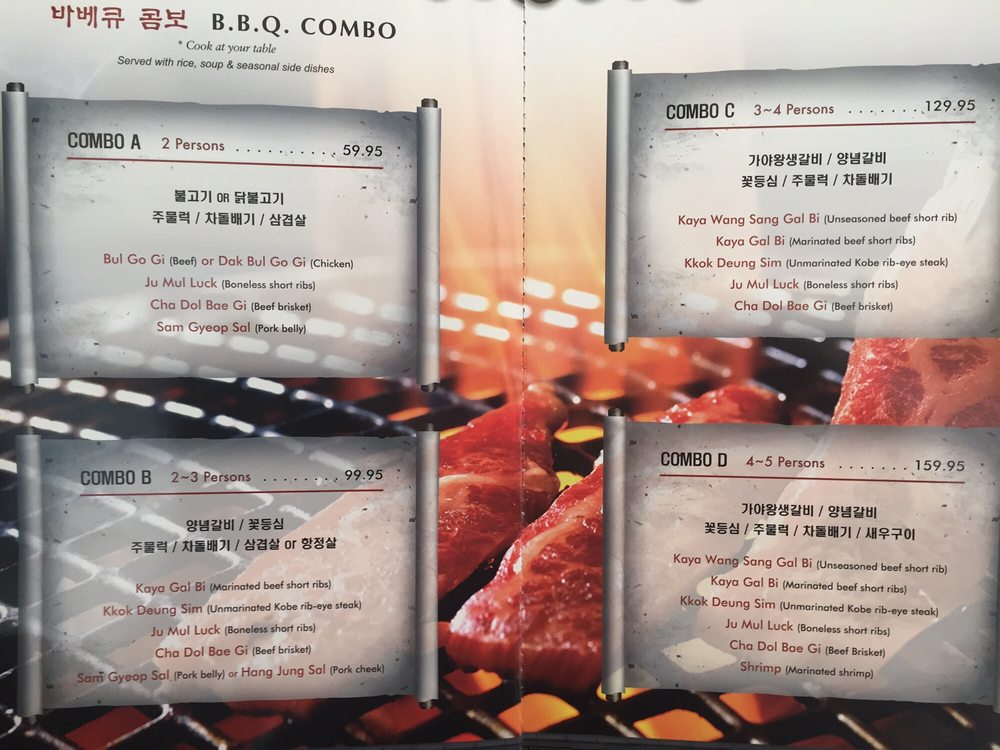 (4~5 persons) comes with KAYA Wang Sang Galbi, KAYA Wang Galbi, Deung Sim, Cha Dol Ba Gi, and choice of Samgyeopsal or Hang Jung Sal.
